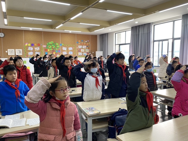 早晨九点,各班准时打开电脑,登录教育部全国青少年普法网收看网络直播。当国歌响起,大屏幕中的国旗徐徐上升之时,学生们昂首挺胸,高举手臂行少先队队礼,老师行注目礼。